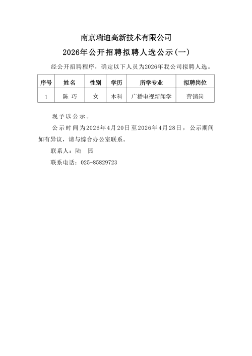 南京瑞迪高新技术有限公司2026年公开招聘拟聘人选公示(一)